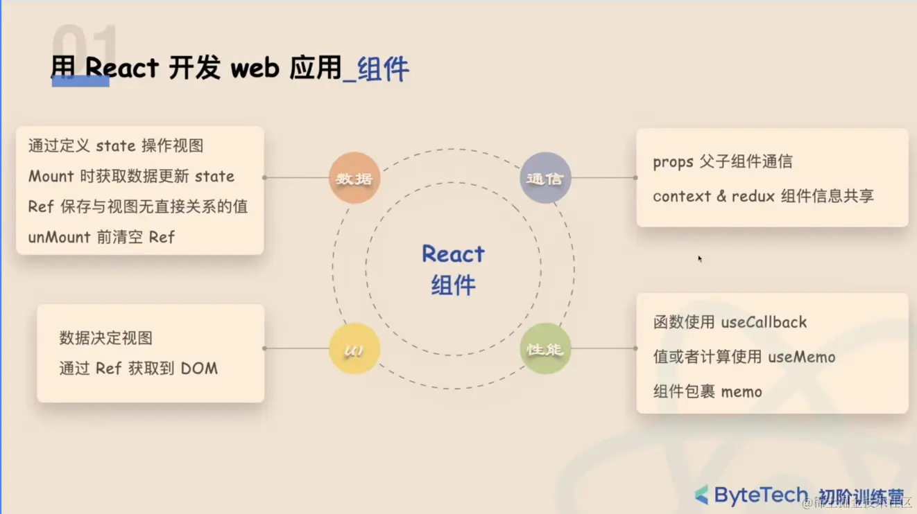 - 数据:通过定义state操作视图,mount时获取数据更新state,ref保存与视图无关的值,unmount前清空ref.