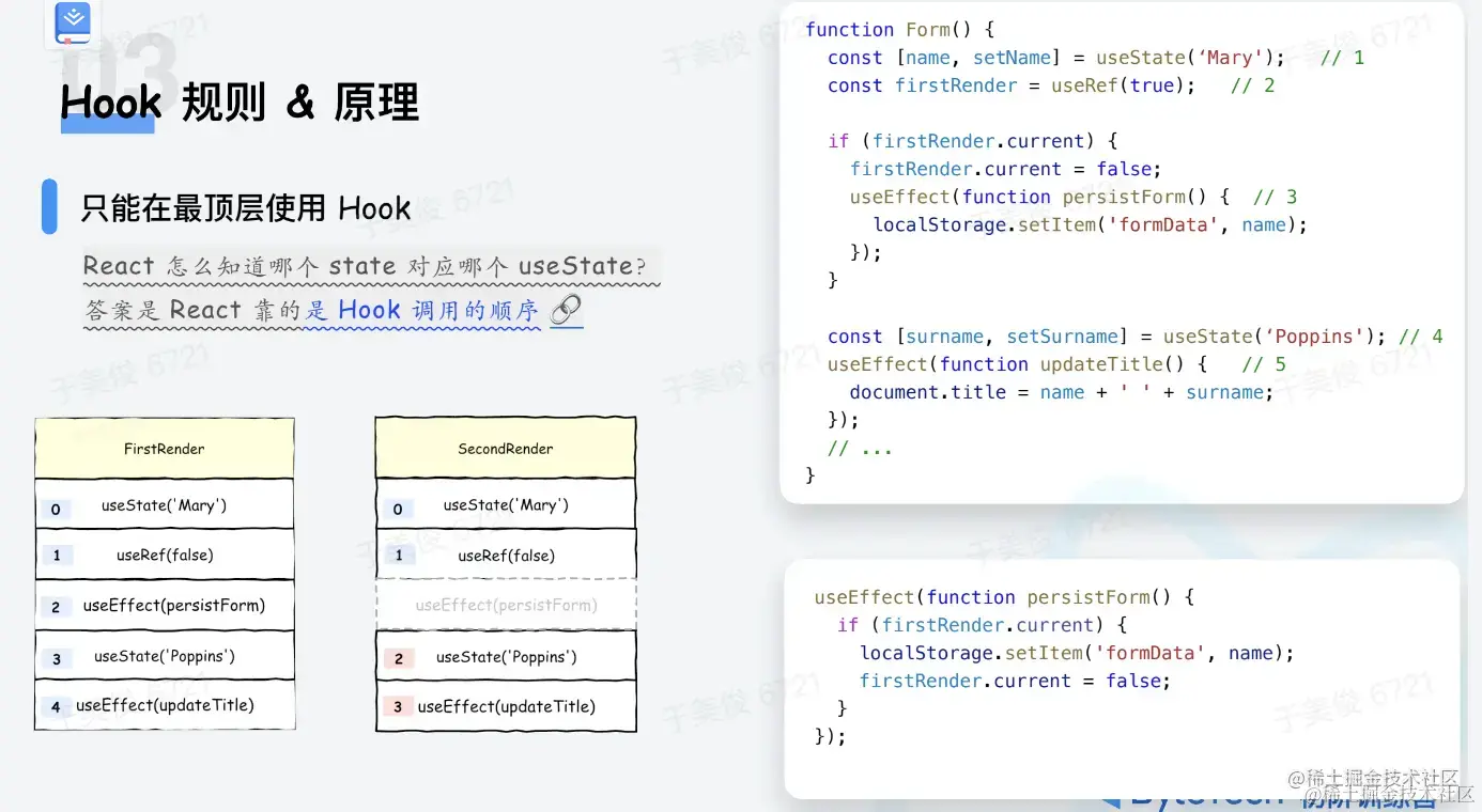这些规则的目的是确保 Hook 在每一次渲染中都按照同样的顺序被调用,从而让 React 能够在多次的 useState 和 useEffect 调用之间保持 hook 状态的正确