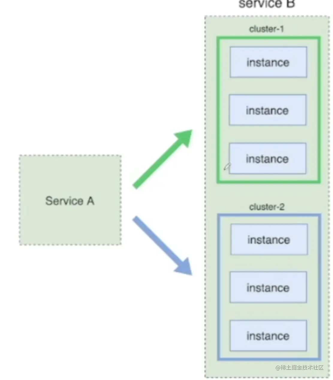 - 操作:将服务B分成蓝色部分和绿色部分,当要发布绿色部分时将绿色部分的流量切给蓝色部分,此时就可以将绿色部分更新,若没有问题将绿色部分的流量切回去。以同样步骤操作即可部署蓝色部分