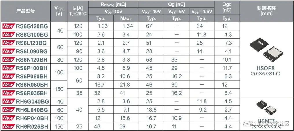 全球知名半导体制造商ROHM (总部位于日本京都市)新推出“RS6xxxxBx/ RH6xxxxBx系列”共13款 Nch MOSFET*1产品(40V/60V/80V/100V/150V), 这些产品非常适合驱动以24V 、36V 、48V级电源 供电的应用,例如基站和服务器用的电源、工业和消费电子设备用的电机等。
