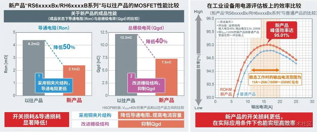 新产品不仅利用微细化工艺提高了器件性能,还通过采用低阻值铜夹片连接的HSOP8封装和HSMT8封装, 实现了仅2.1mQ的业界超低导通电阻(Ron) 2 ,相比以往产品, 导通电阻降低了50% 。另外, 通过改 进栅极结构, Qgd3 (栅-漏电荷,通常与导通电阻之间存在权衡关系)也比以往产品减少了约40% (Ron和 Qgd均为耐压60V的HSOP8封装产品之间的比较) 。这可以降低开关损耗和导通损耗,非常有助于各种应 用产品的高效率工作。例如,当在工业设备用电源评估板上比较电源效率时,新产品在稳态工作时的输出 电流范围内,实现了业界超高的电源效率(峰值时高达约95%)。