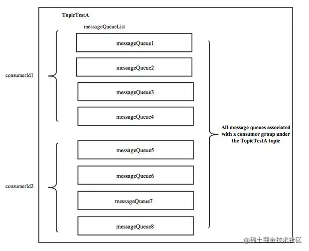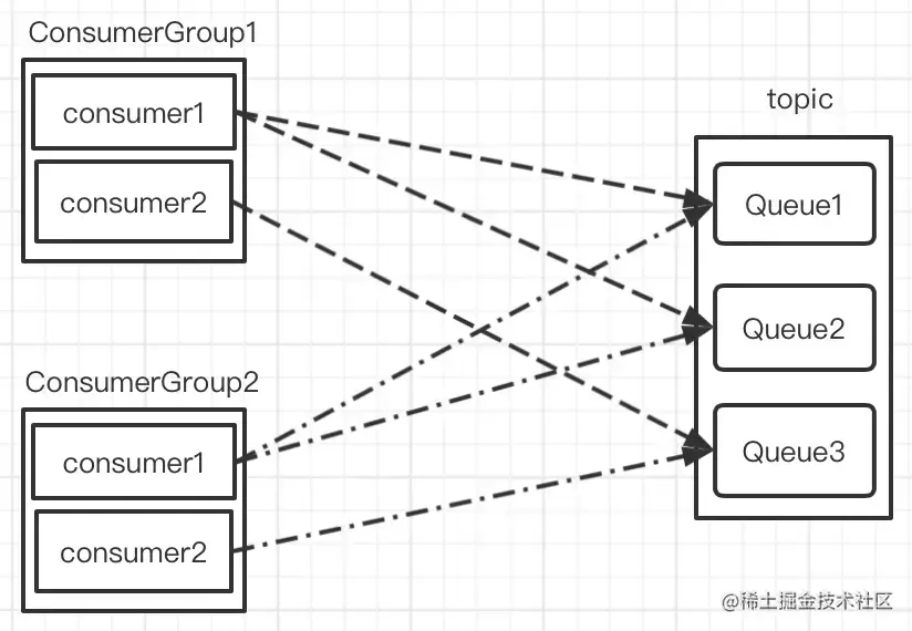如图所示,同一topic下有3个MessageQueue,有两个consumerGroup去消费这3个MessageQueue上的消息,consumerGroup1中的consumer1会消息MessageQueue1、MessageQueue2上的消息,consumerGroup1中的consumer2会消息MessageQueue3上的消息;consumerGroup2中的consumer1会消息MessageQueue1、MessageQueue2上的消息,consumerGroup2中的consumer2会消息MessageQueue3上的消息。