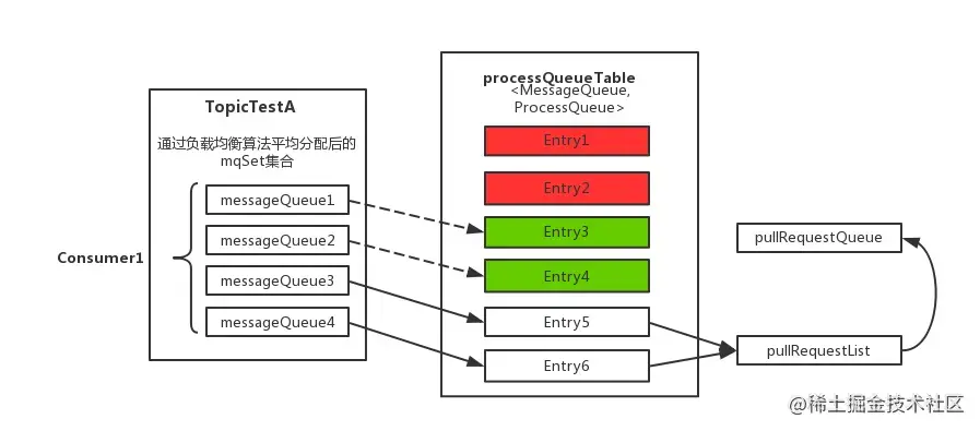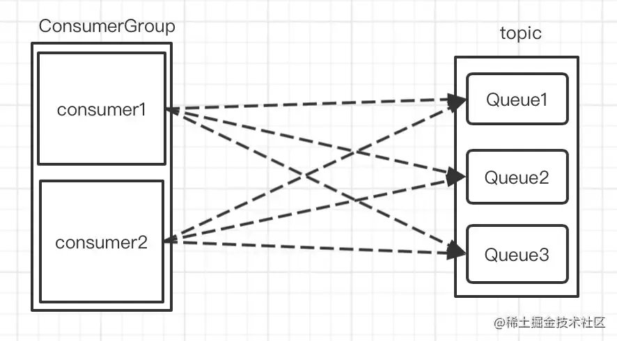 消息消费队列在同一消费组不同消费者之间的负载均衡,其核心设计理念是在一个消息消费队列在同一时间只允许被同一消费组内的一个消费者消费,一个消息消费者能同时消费多个消息队列。
