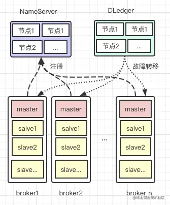 RocketMq 的高可用由 DLedger 提供,整个 broker 的高可用架构如下:
