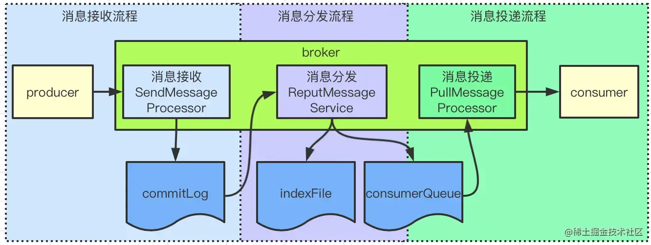 producer的消息,处理类是SendMessageProcessor,将消息写入到commigLog文件后,接收流程处理完毕; - 消息分发: