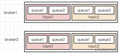 在图中,共有2个broker,2个topic,每个topic都有4个队列。在producer发送消息时,是发送到具体的队列上,consumer获取消息时,也是从队列上获取。