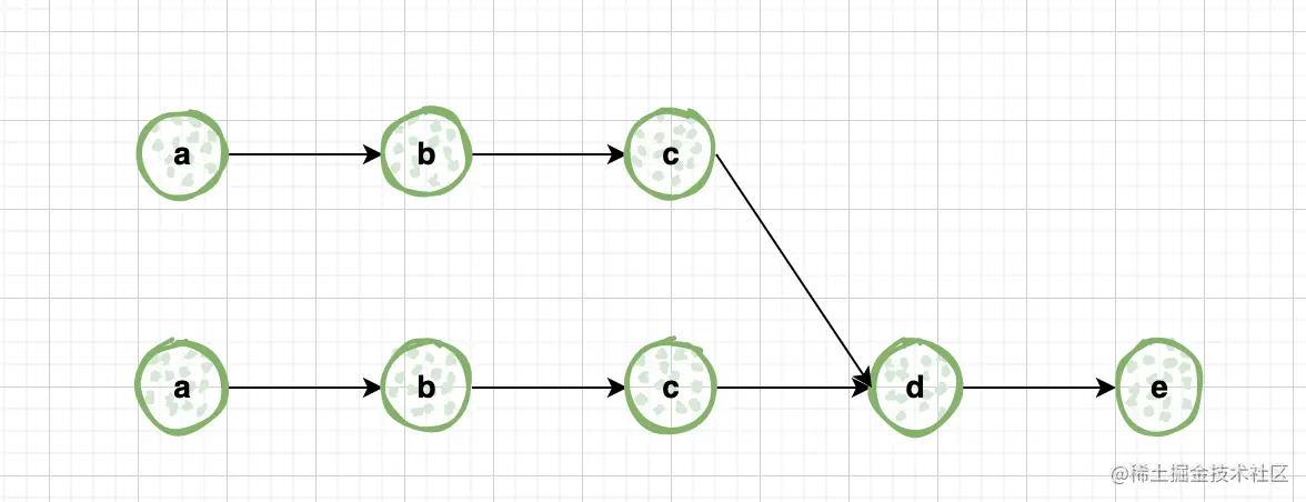 20步,然后两个链表依次一步一步走。 - 如果遇到的节点是同一个,则这个节点就是相交的第一个节点。