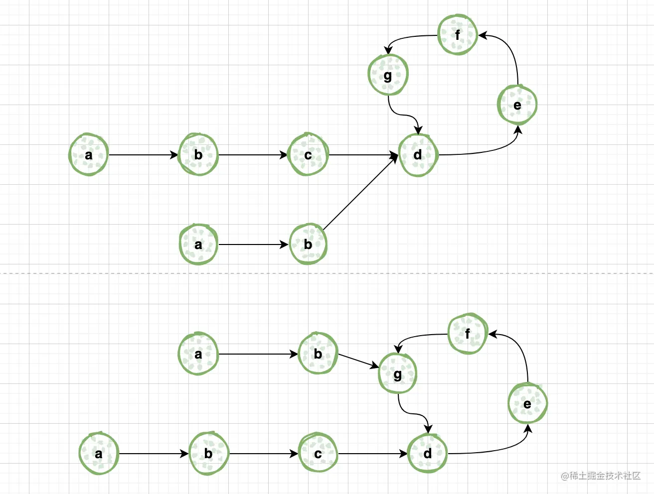 还可以使用快慢指针来判断链表是否有环,判断方式如下: