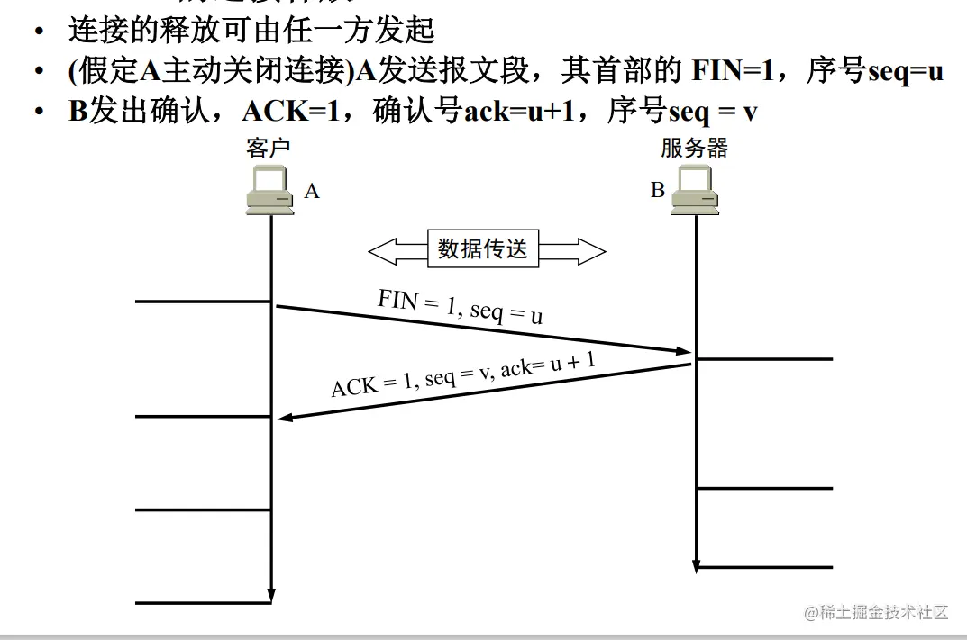 ① A向B发出连接请求报文段,其首部中的SYN=1,并选择序号seq=x, 表明传送数据时的第一个数据字节的序号是x