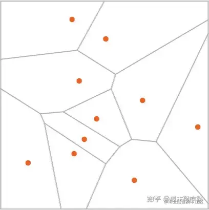 作为一个直接的类比,我们假设在平面上有某些位置,用点表示(在现实生活中,它们可能是咖啡店的位置)。那么我们可以想象,从平面上的任何一点开始,我们总是想在最近的点结束(即我们总是去最近的咖啡店)。我们可以通过将平面划分为由理想化的 “分水岭” 分隔的区域(“吸引盆地”)来表示这一点: