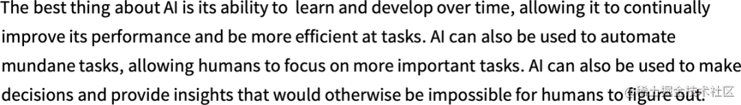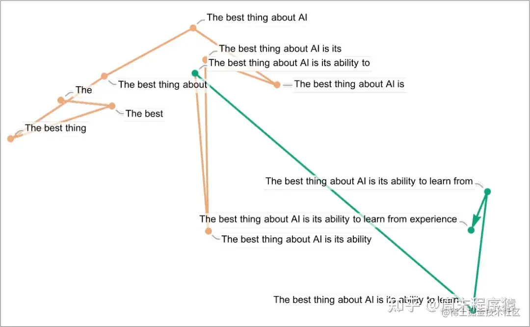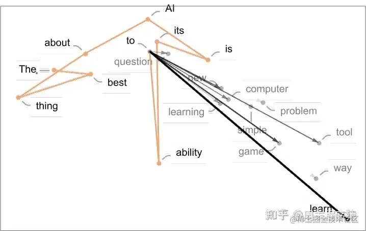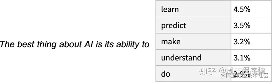 首先要解释的是,ChatGPT 从根本上说总是试图对它目前得到的任何文本进行 “合理的延续”,这里的 “合理” 是指 “在看到人们在数十亿个网页上所写的东西之后,人们可能会期望某人写出什么”。因此,假设我们已经得到了 “人工智能最好的是它能去做 ……” 的文本(”The best thing about AI is its ability to”)。想象一下,扫描数十亿页的人类书写的文本(例如在网络上和数字化书籍中),并找到这个文本的所有实例 —— 然后看到什么词在接下来的时间里出现了多少。ChatGPT 有效地做了类似的事情,除了(正如我将解释的)它不看字面文本;它寻找在某种意义上 “意义相符” 的东西。但最终的结果是,它产生了一个可能出现在后面的词的排序列表,以及 “概率”。