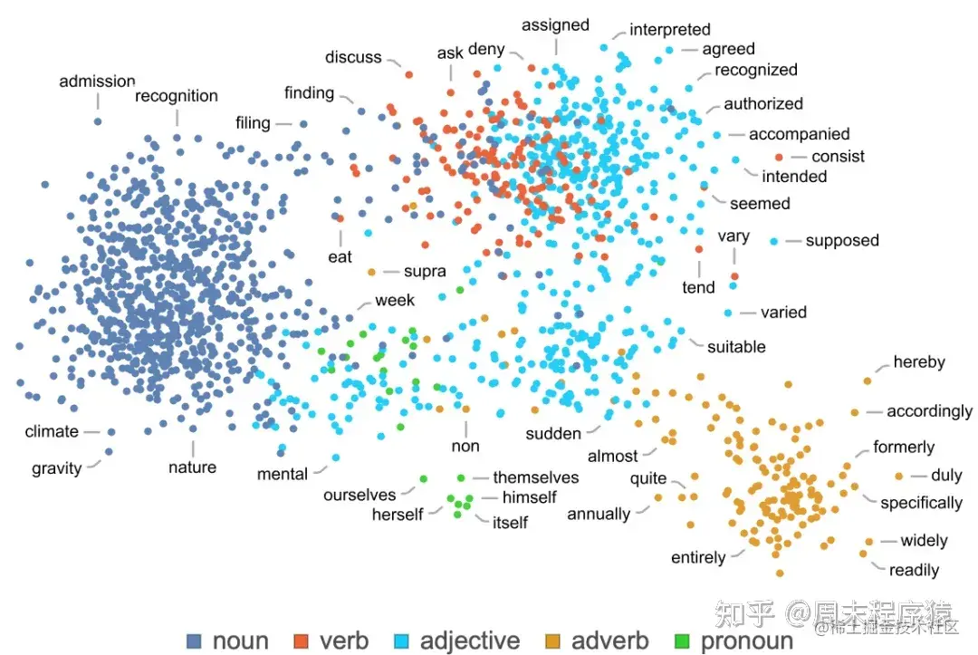那么,这个语言学特征空间是什么样子的呢?下面是一个例子,说明如果我们把这样一个特征空间投射到二维空间,单个词(这里是指普通名词)是如何布局的: