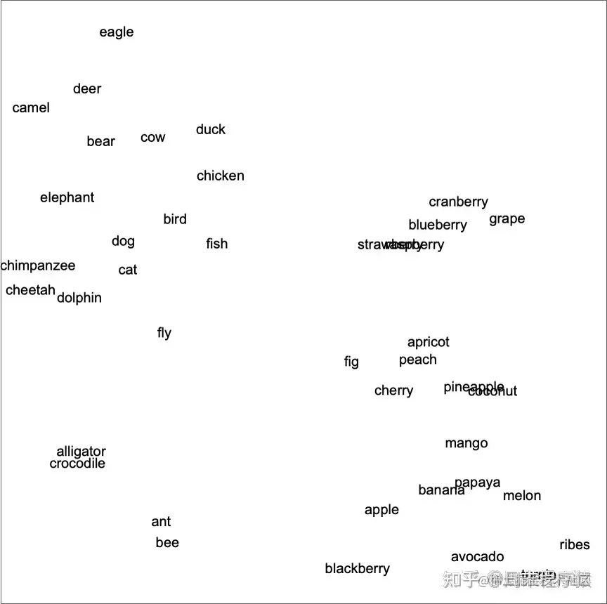 我们在上面看到的另一个例子是基于代表植物和动物的词。但这两种情况下的重点是,“语义相似的词” 被放在附近。