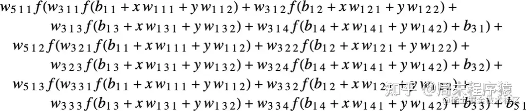 最终,每个神经网络都对应于一些整体的数学函数 —— 尽管它可能写得很乱。对于上面的例子,它就是: