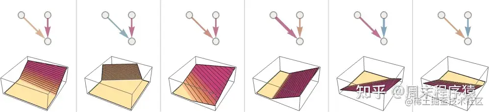 但让我们回到单个神经元上。下面是一个有两个输入(代表坐标 x 和 y)的神经元在选择不同的权重和常数(以及 Ramp 作为激活函数)后可以计算的函数的一些例子: