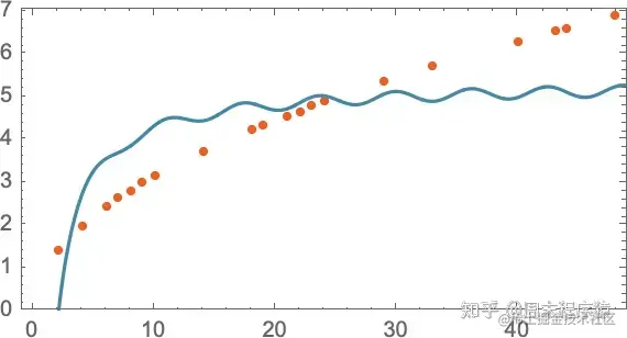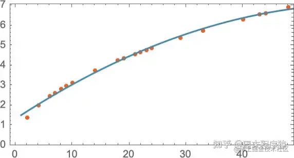 我们怎么知道要在这里尝试使用一条直线呢?在某种程度上我们不知道。这只是数学上简单的东西,而我们已经习惯了这样的事实:我们测量的很多数据都被数学上简单的东西很好地拟合了。我们可以尝试一些数学上更复杂的东西 —— 比如说 a + bx + cx2,然后在这种情况下,我们做得更好: