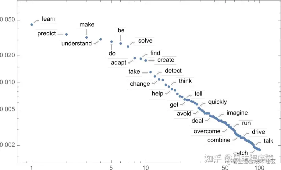 值得指出的是,即使在第一步,也有很多可能的 “下一个词” 可供选择(温度为 0.8),尽管它们的概率下降得很快(是的,这个对数图上的直线对应于 n-1 的 “幂律” 衰减,这是语言的一般统计的特点):