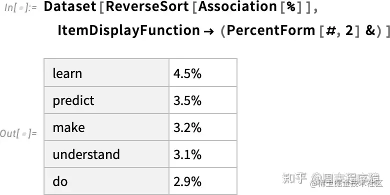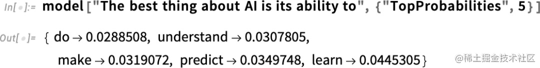 稍后,我们将看看这个神经网的内部,并谈谈它是如何工作的。但现在我们可以把这个 “网络模型” 作为一个黑匣子应用于我们迄今为止的文本,并要求按概率计算出该模型认为应该遵循的前五个词:
