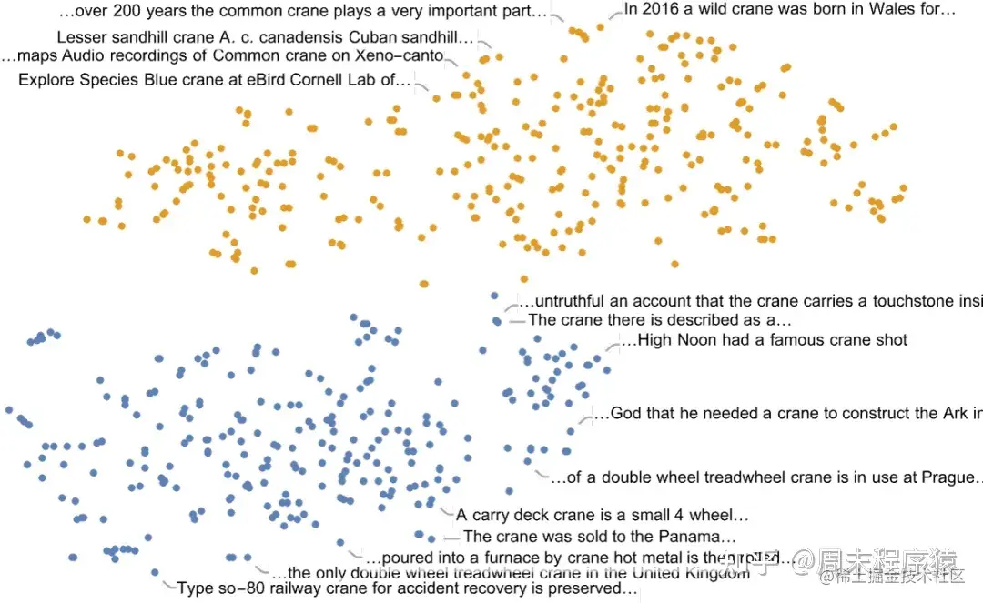 当然,一个给定的词一般来说并不只有 “一个意思”(或一定只对应一个语篇)。通过观察包含一个词的句子在特征空间中的布局,我们通常可以 “区分” 出不同的含义 —— 就像这里的例子 “起重机”(crane, “鸟” 或 “机器”?):