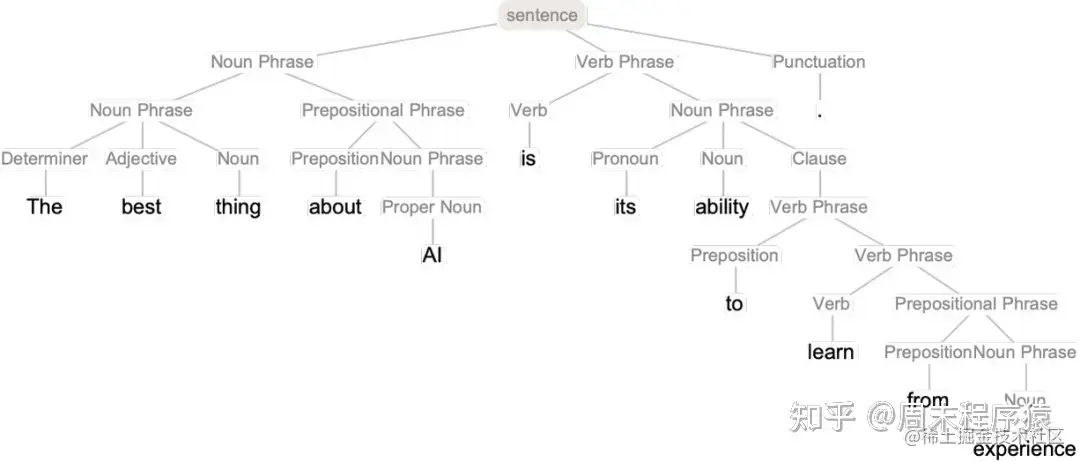 第一个是语言的语法。语言并不只是一个随机的词语组合。相反,对于不同种类的单词如何放在一起,有(相当)明确的语法规则:例如,在英语中,名词前面可以有形容词,后面可以有动词,但通常两个名词不能紧挨着。这样的语法结构可以(至少是近似地)被一套规则所捕获,这些规则定义了如何将相当于 “解析树” 的东西放在一起: