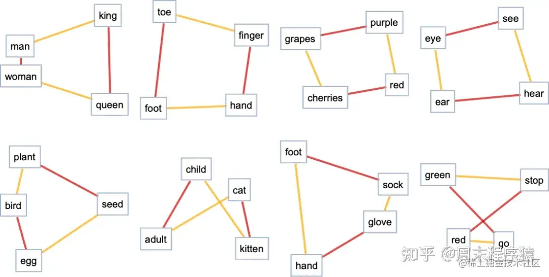 好的,所以我们至少可以认为这个特征空间是把 “意义相近的词” 放在这个空间里的,这是合理的。但是,在这个空间里,我们可以确定什么样的额外结构?例如,是否存在某种 “平行运输” 的概念,以反映空间中的 “平坦性”?掌握这个问题的一个方法是看一下类比: