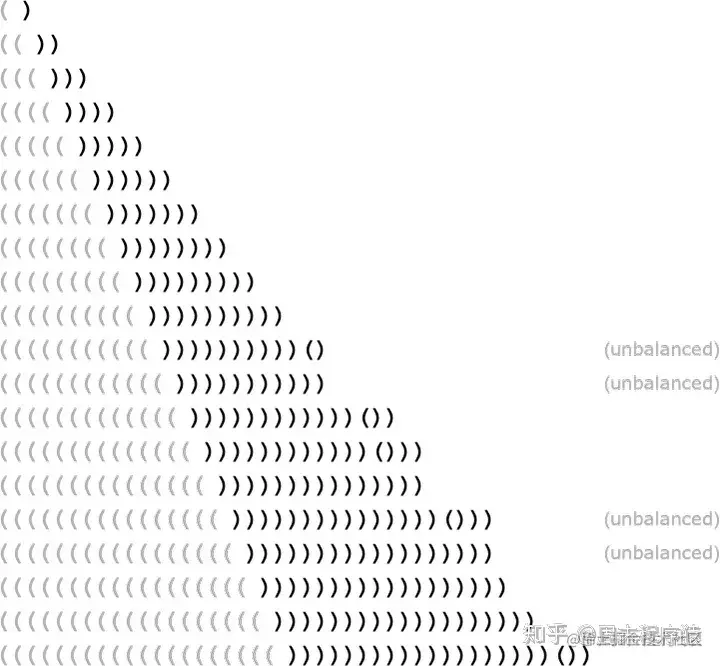 是的,在一定长度内,网络做得很好。但随后它就开始失败了。这是在神经网络(或一般的机器学习)的这种 “精确” 情况下看到的非常典型的事情。人类 “一眼就能解决” 的情况,神经网络也能解决。但是需要做一些 “更多的算法”(例如明确地计算括号是否封闭)的情况,神经网络往往在某种程度上是 “计算上太浅”,无法可靠地做到。(顺便说一句,即使是目前完整的 ChatGPT 也很难正确匹配长序列中的括号)。