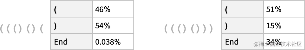 在第一种情况下,网络 “非常确定” 序列不能在这里结束 —— 这很好,因为如果它结束了,小括号就会留下不平衡。然而,在第二种情况下,它 “正确地认识到” 序列可以在这里结束,尽管它也 “指出” 有可能 “重新开始”,放下一个 “(”,估计后面还有一个 “)”。但是,哎呀,即使它有 40 万个左右经过艰苦训练的权重,它也说有 15% 的概率将 “)” 作为下一个标记 —— 这是不对的,因为这必然会导致一个不平衡的括号。