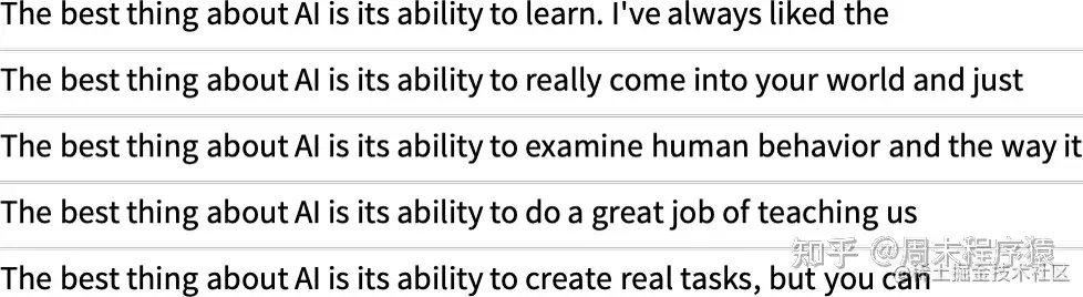 而每次这样做,都会有不同的随机选择,文本也会不同 —— 如这 5 个例子: