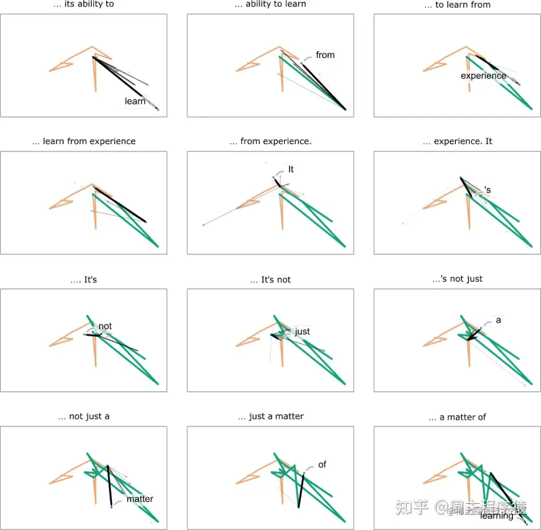 好吧,在经历了一个注意力区块之后,我们得到了一个新的嵌入向量 —— 然后它又被连续地传递到其他的注意力区块中(GPT-2 共有 12 个;GPT-3 有 96 个)。每个注意力区块都有自己特定的 “注意力” 和 “完全连接” 权重模式。这里是 GPT-2 的 “你好,再见” 输入的注意权重序列,用于第一个注意头(attention head):