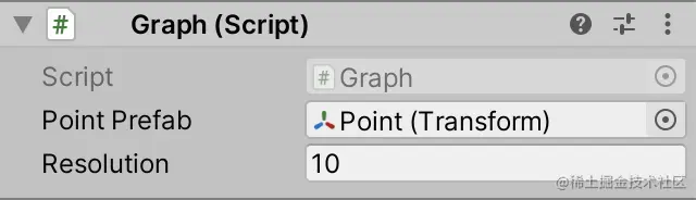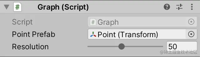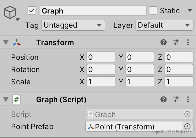 在场景中添加一个空的游戏对象,并将其命名为 Graph 。确保其位置和旋转为零,并且其比例为 1。将我们的 **Graph** 组件添加到此对象。然后将我们的预制件资源拖到图形的 Point Prefab 字段上。它现在包含对预制件的 [Transform](http://docs.unity3d.com/Documentation/ScriptReference/Transform.html) 组件的引用。