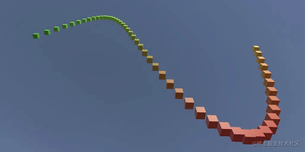 现在我们将在进入游戏模式后获得十个立方体。但他们最终都处于相同的位置。要沿 X 轴将它们排成一行,请将 right 向量乘以 i 。