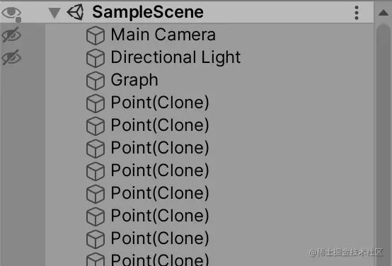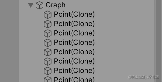这些点当前是根对象,但它们是图形对象的子对象是有意义的。我们可以在实例化点后建立这种关系,方法是调用其 [Transform](http://docs.unity3d.com/Documentation/ScriptReference/Transform.html) 组件的 SetParent 方法,向其传递所需的父级 [Transform](http://docs.unity3d.com/Documentation/ScriptReference/Transform.html) 。我们可以通过 **Graph** 的 transform 属性获取图形对象的 [Transform](http://docs.unity3d.com/Documentation/ScriptReference/Transform.html) 组件,它继承自 [Component](http://docs.unity3d.com/Documentation/ScriptReference/Component.html) 。在循环块的末尾执行此操作。