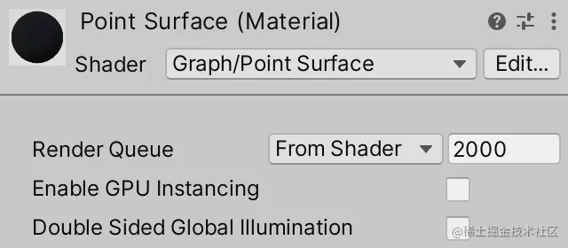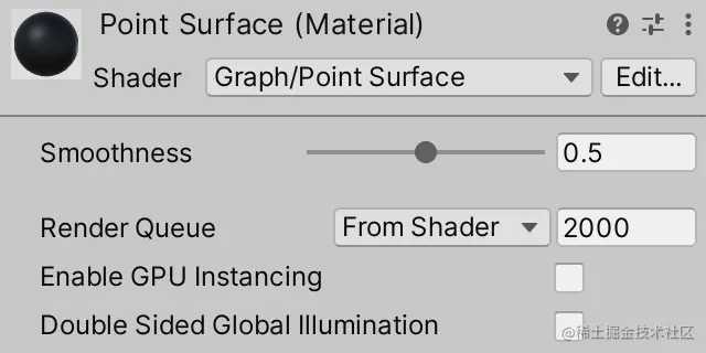 现在我们有一个正常运行的着色器,为它创建一个材质,名为 Point Surface .将其设置为使用我们的着色器,方法是通过其检查器标题中的 Shader 下拉列表选择 Graph / Point Surface 。