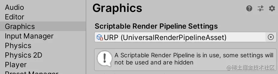 接下来,转到项目设置的 Graphics 部分,并将 URP 资源分配给 Scriptable Renderer Pipeline Settings 字段。