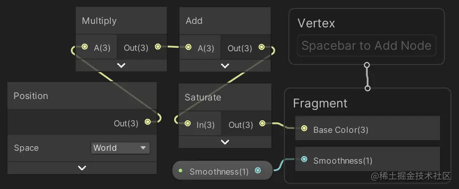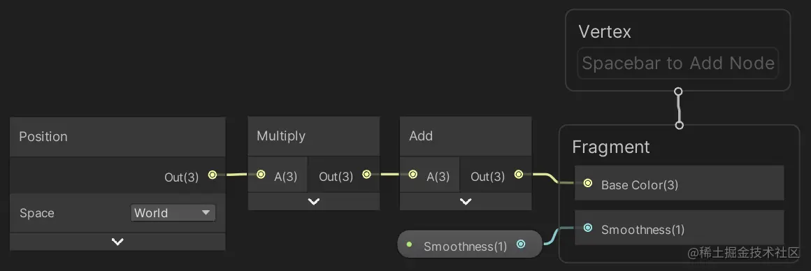 我们现在有一个位置节点,默认情况下设置为世界空间。您可以通过按将光标悬停在其上时显示的向上箭头来折叠其预览可视化效果。