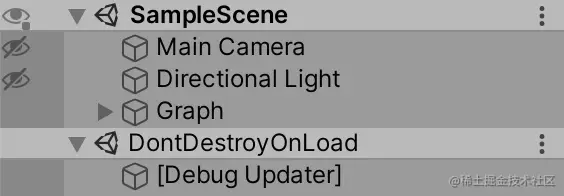 保存着色器资源后,我们现在在播放模式下获得与使用默认渲染管线时相同的色点。除此之外,调试更新程序在播放模式下出现在单独的 DontDestroyOnLoad 场景中。这是用于调试 URP,可以忽略。