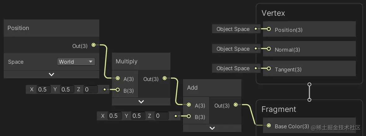 使用相同的方法创建 Multiply 节点和 Add 节点。使用它们将位置的 XY 分量缩放 0.5,然后添加 0.5,同时将 Z 设置为零。这些节点根据它们所连接的内容调整其输入类型。因此,首先连接节点,然后填写其常量输入。然后将结果连接到片段的 Base Color 输入。