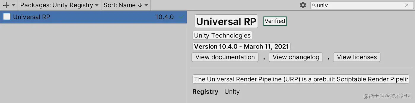 如果您尚未使用 URP,请转到包管理器并安装针对您的 Unity 版本验证的最新 Universal RP 包。就我而言,这是 10.4.0。