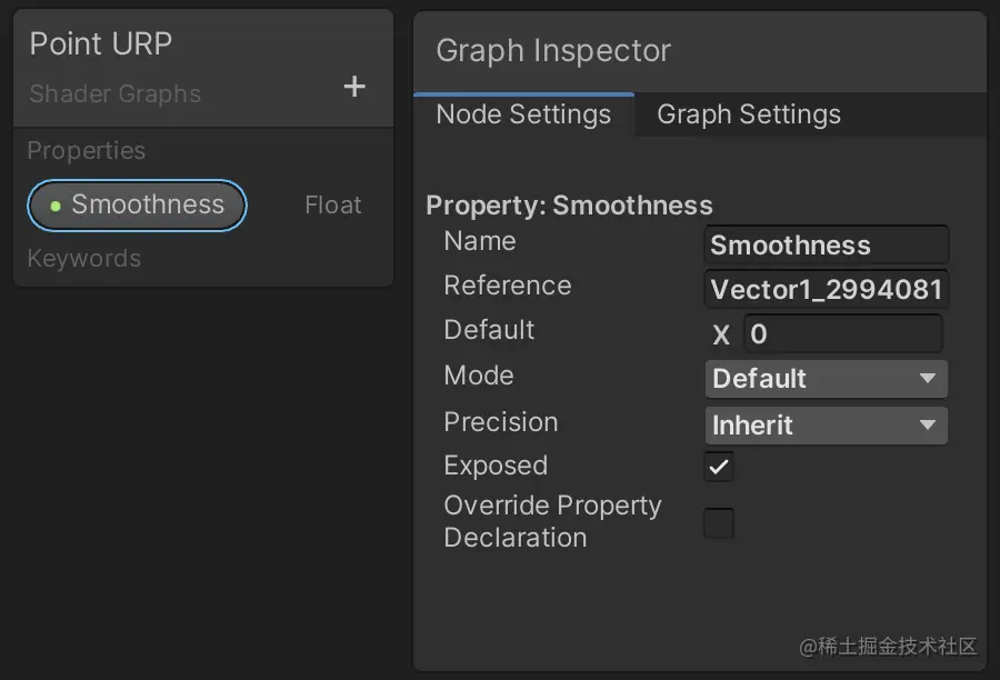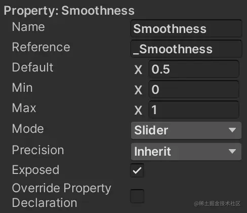 引用是属性在内部已知的名称。这与我们在表面着色器代码中命名属性字段_Smoothness的方式相对应,因此让我们在这里也使用相同的内部名称。然后将其下方的默认值设置为 0.5。确保其 Exposed 切换选项已启用,因为这控制材质是否为其获取着色器属性。最后,要使其显示为滑块,请将其 Mode 更改为 Slider 。