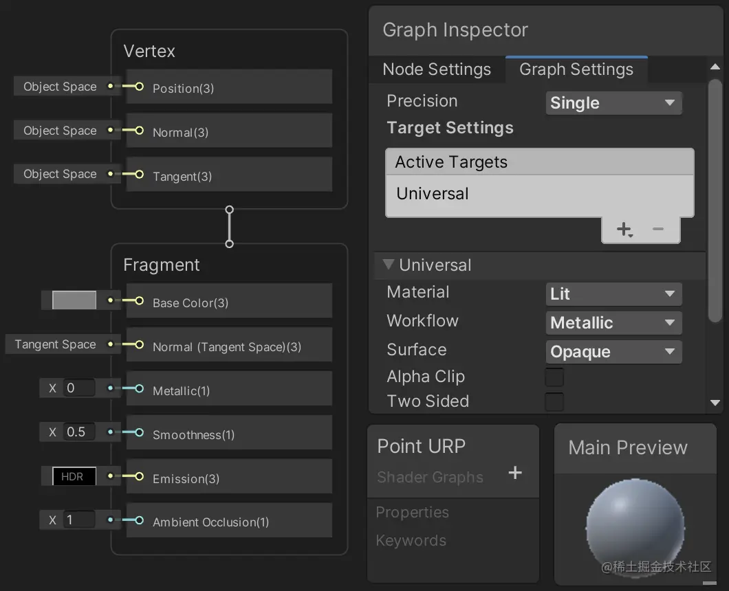 通过 Assets / Create / Shader / Universal Render Pipeline / Lit Shader Graph 创建一个新的着色器图并将其命名为 Point URP 。
