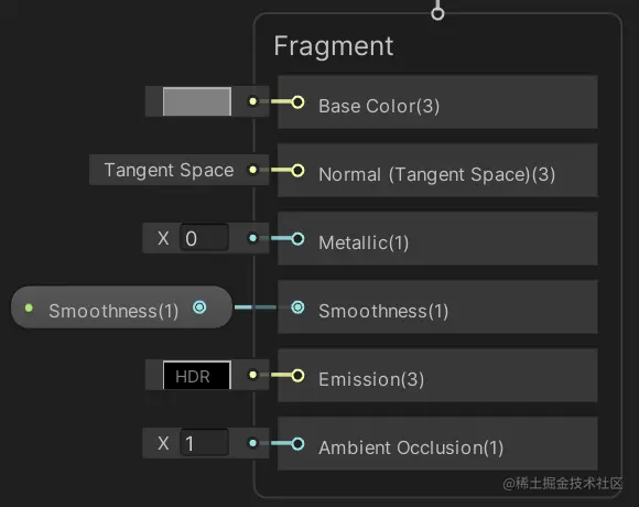 着色器图由表示数据或操作的节点组成。目前,片段节点的 Smoothness 值设置为 0.5。要使其成为可配置的着色器属性,请按 Point URP 背板面板上的加号按钮,选择 Float ,然后将新条目命名为 Smoothness。这会向表示属性的黑板添加一个圆角按钮。选择它并将图形检查器切换到其“节点设置”选项卡以查看此属性的配置。