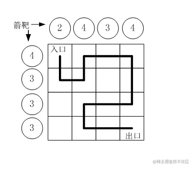 骑士从左上角起点出发,没走一步,往左边和上边对应位置射一箭,题目在方格的左边和上边给出了骑士从起点到终点射箭的数量,现在让我们求骑士行走的路线。