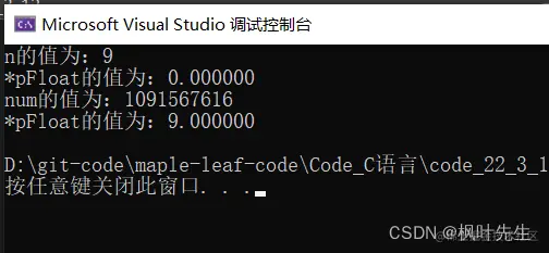 int main() { int n = 9; float *pFloat = (float *)&n; printf("n的值为:%d\n",n); printf("*pFloat的值为:%f\n",*pFloat); *pFloat = 9.0; printf("num的值为:%d\n",n); printf("*pFloat的值为:%f\n",*pFloat); return 0; }猜猜结果是多少??