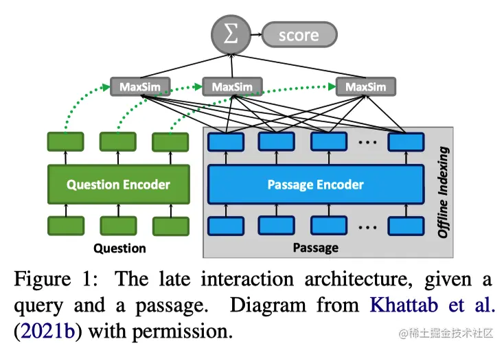 ColBERT为查询(和文档)中的每个token生成嵌入表示,并将相关性建模为每个查询向量与文档中所有向量之间最大相似度的和。这种方法通过将相关性建模分解为token级计算,在后期交互中旨在减轻编码器的负担,但其消耗了比单向量模型更大数量级的空间占用,因为它们必须为Web规模的集合存储数十亿个小向量。