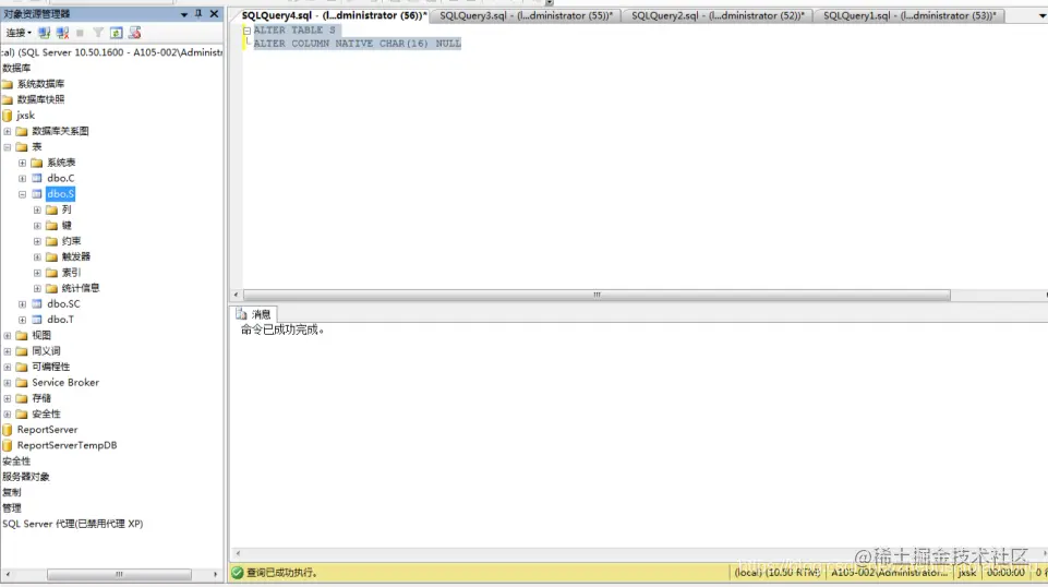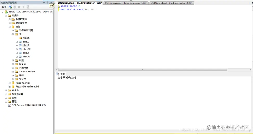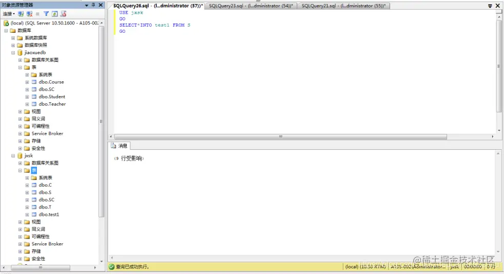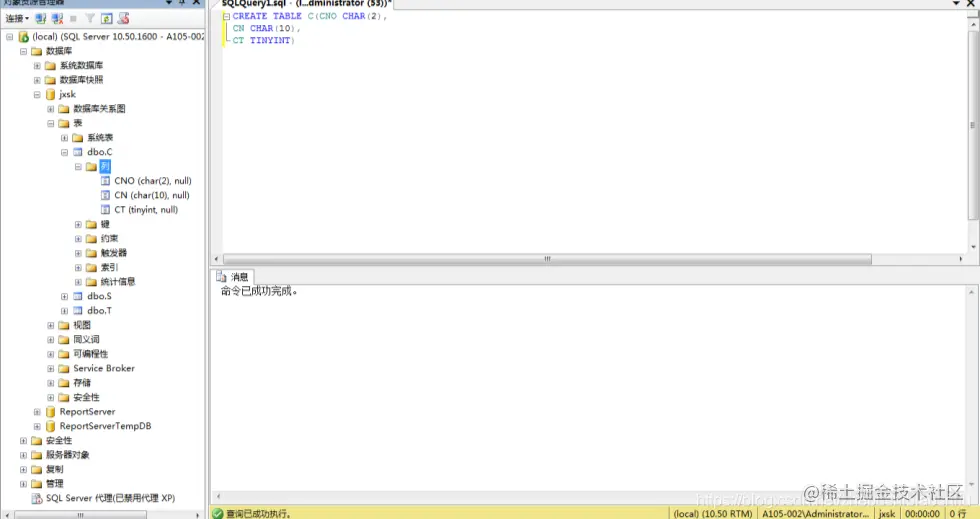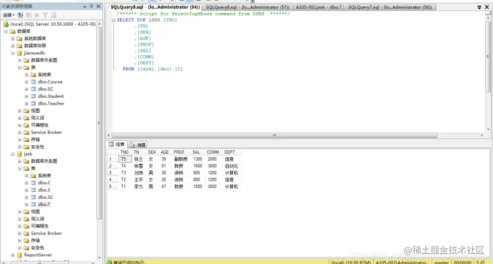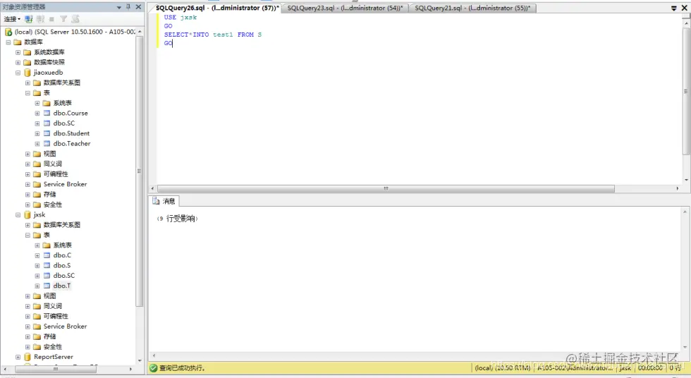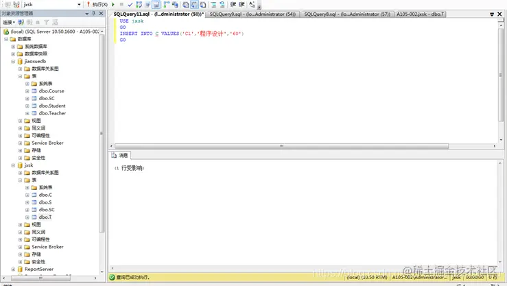 (2) 将jxsk设置为当前数据库,单击 “工具栏”中的“执行(x)”按钮,即可执行上述T-SQL语句,如下图;