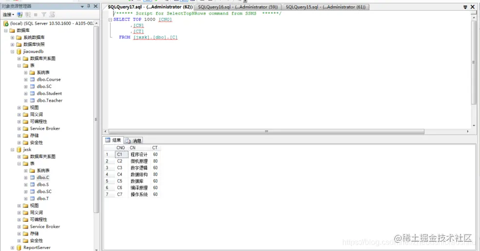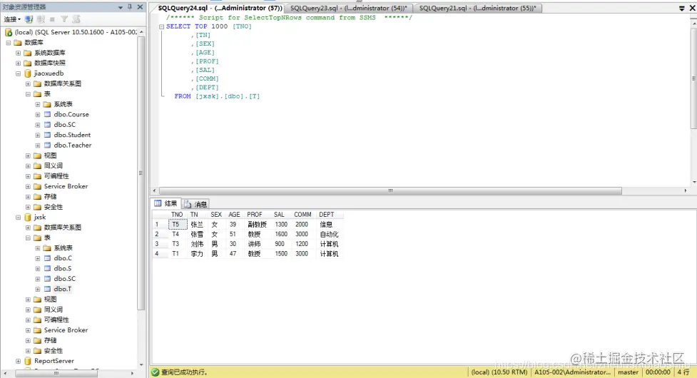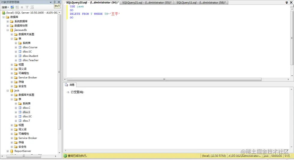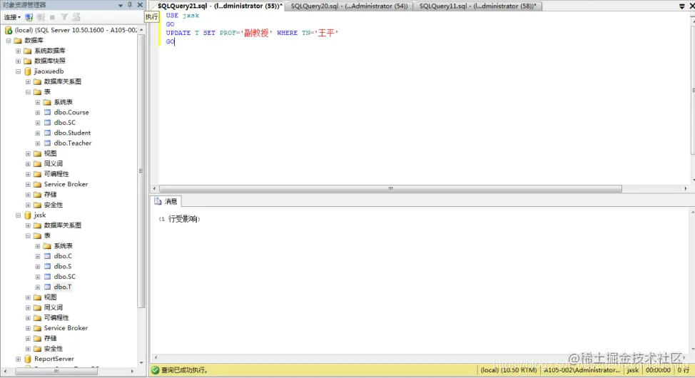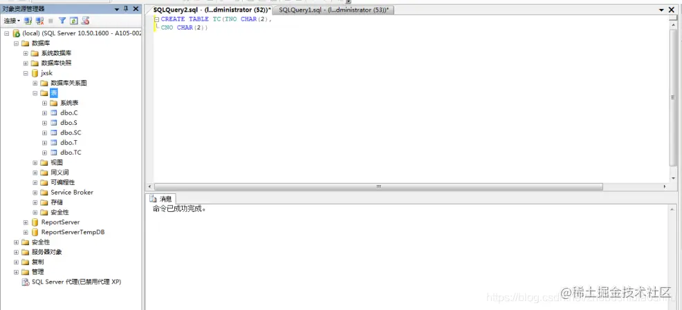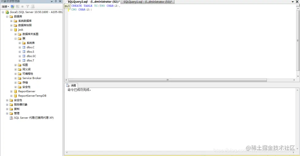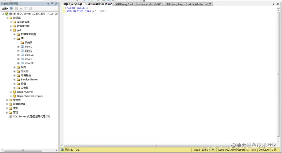 (2) 将jxsk设置为当前数据库,单击 “工具栏”中的“执行(x)”按钮,即可执行上述T-SQL语句,如下图;