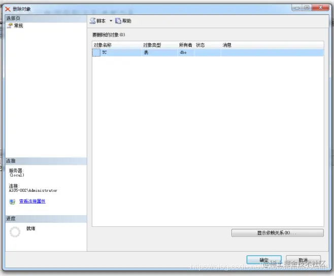 (2) 可以发现在“删除对象”列表中存在待删除的数据库表TC,单击“确定”按钮,完成删除数据库表TC操作,如下图;