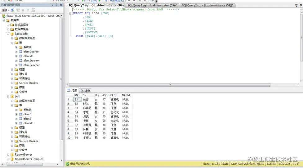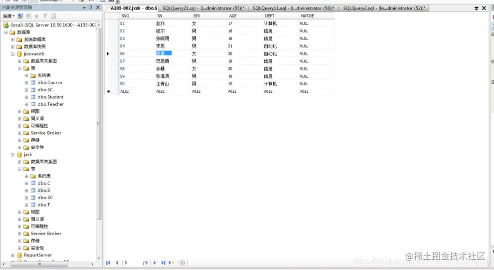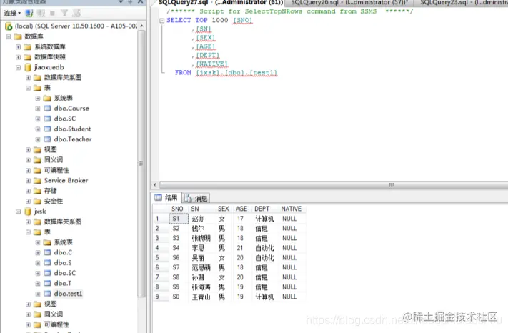 (7) 在“对象资源管理器”窗格中,选择“数据库”→“jxsk”→“表”并右击表S,在弹出的菜单中选择“选择前1000行”可查看表中内容,如下图。