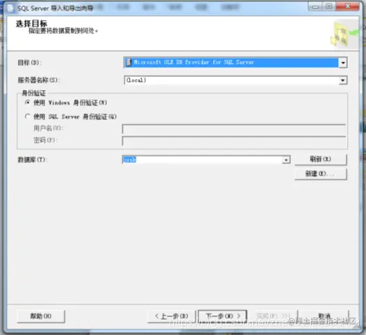 (5) 选择“下一步”按钮,打开“选择目标”窗口,设置导入目标数据库各选项,并正确配置各选项,如以下图;