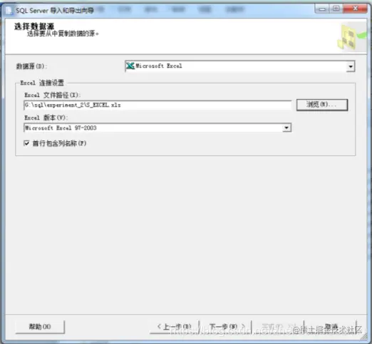 (3) 选择“下一步”按钮,打开“选择数据源”菜单,在“数据源”下拉列表中选择 Microsoft Excel;单击“Excel文件路径”一栏右侧的“浏览”按钮,选择要导入的源数据文件S_EXCEL.xls,如下图;
